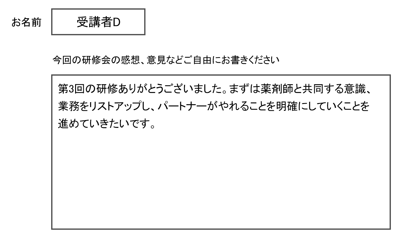 また、契約だけでなく、施設業務を行う際、薬局内では薬剤師と薬局パートナーがどのような方法で施設の情報を管理・共有するべきか等についてもご説明いたしました。