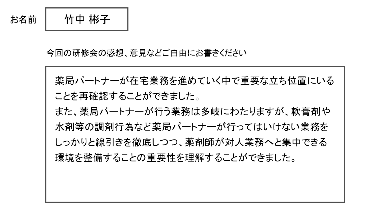 また、日々の業務内容や、薬剤師とはどのような関係性であるか、薬局パートナーはどういうものか等、薬局パートナーの心構えをお話いたしました。