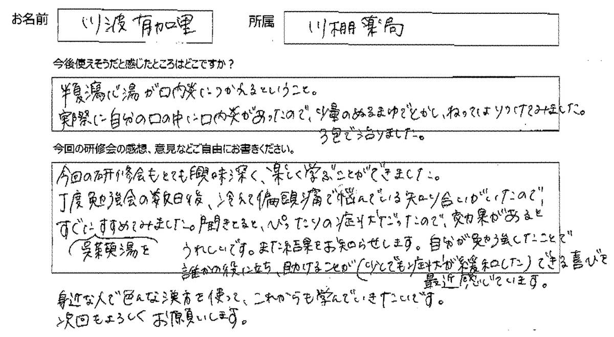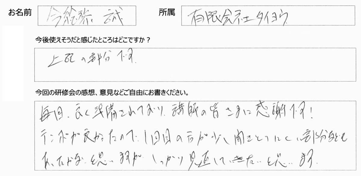参加された皆様のナマの声を掲載しておりますのでこれから受講を検討されている皆様、ご参考にしていただければ幸いです。