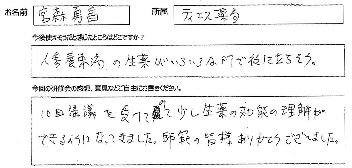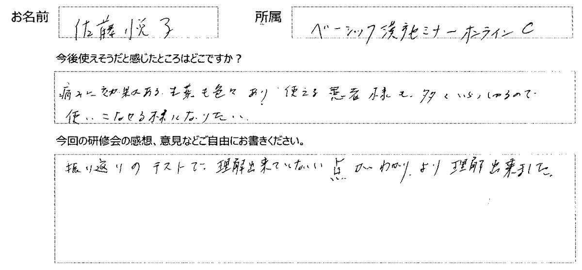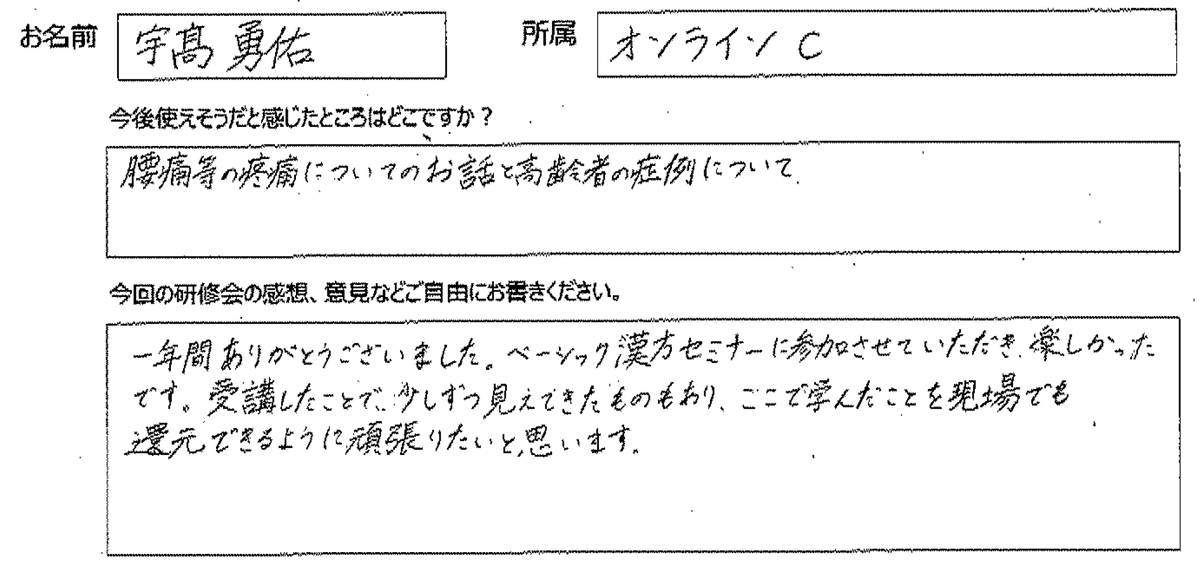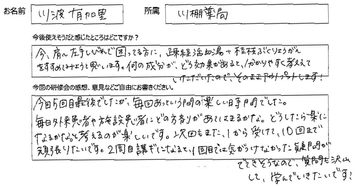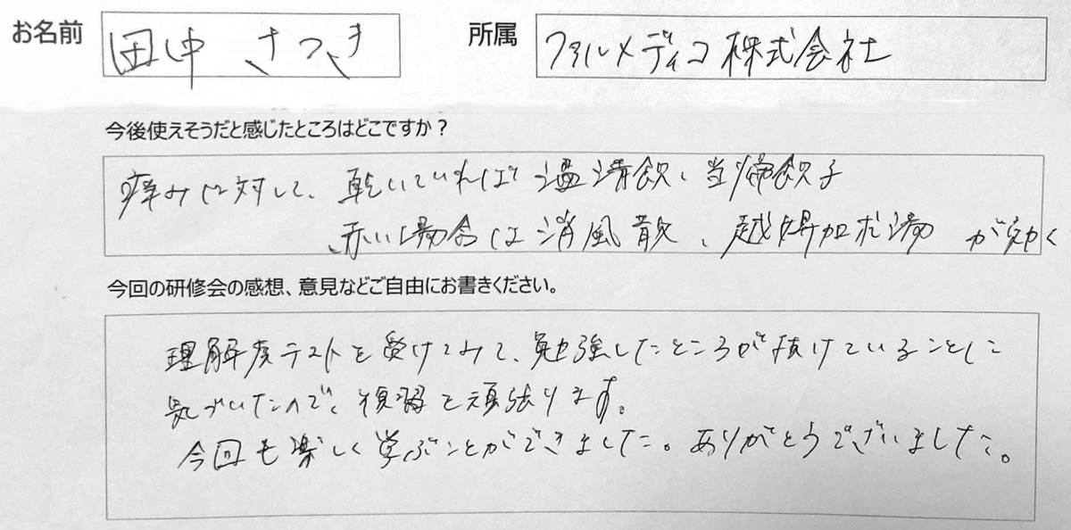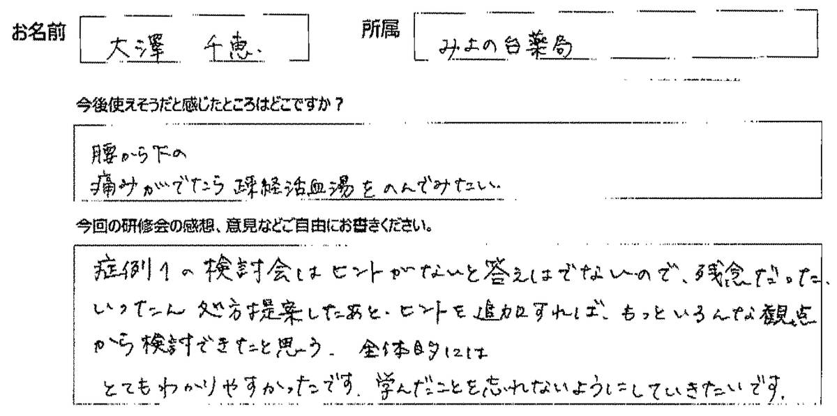 三大体質の設問については全員が正答し、実際に取り組んだ症例については5名が記載しており、学んだ知識を実践に生かしている様子が伺え、大変素晴らしいと感じました。