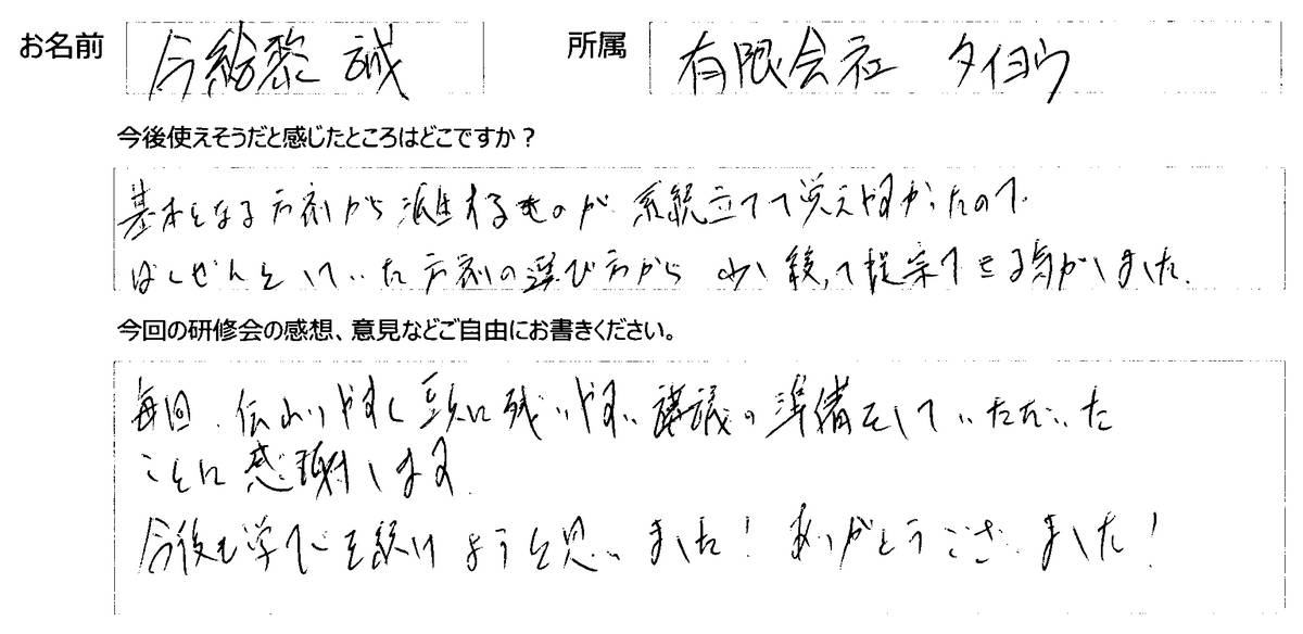 参加された皆様のナマの声を掲載しておりますのでこれから受講を検討されている皆様、ご参考にしていただければ幸いです。