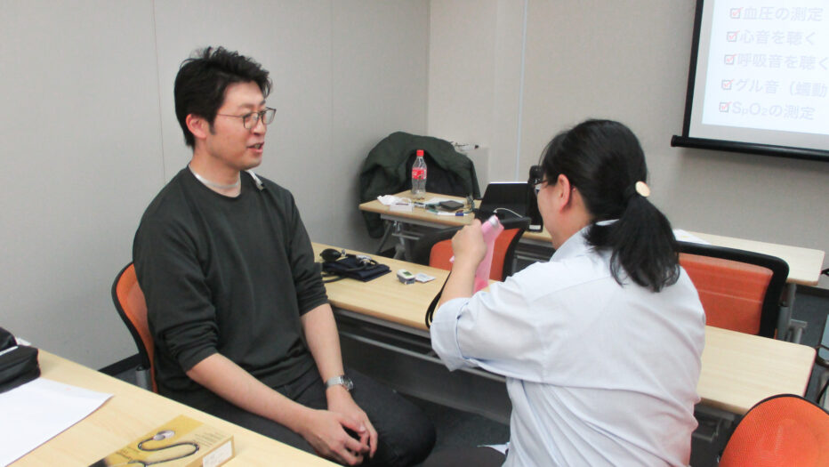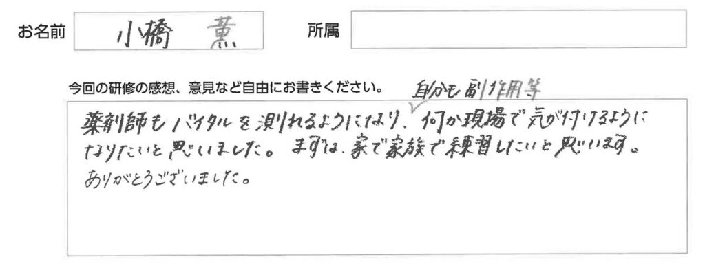座学では薬剤師を取り巻く状況や業務の変化、それらを実践していくための手段として日々の業務にフィジカルアセスメントを組み込んでいく意義を解説、その後のロールプレイでは自らの手でバイタルサインを採集し、新たな薬学的アセスメントを体験していただきました。
